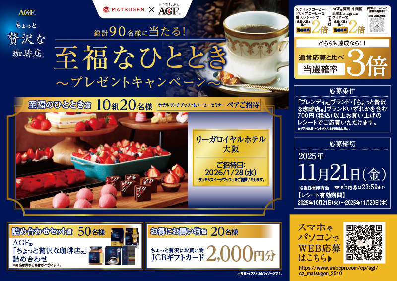 松源×AGF「至福なひとときプレゼントキャンペーン」 2025 10/21 2025年10月21日 【キャンペーン期間(レシート有効期間)】10月21日(火)~11月20日(木) 【応募締切】11月21日(金)※郵送:当日消印有効 ※WEB応募:当日23:59まで WEB応募はこちら キャンペーン