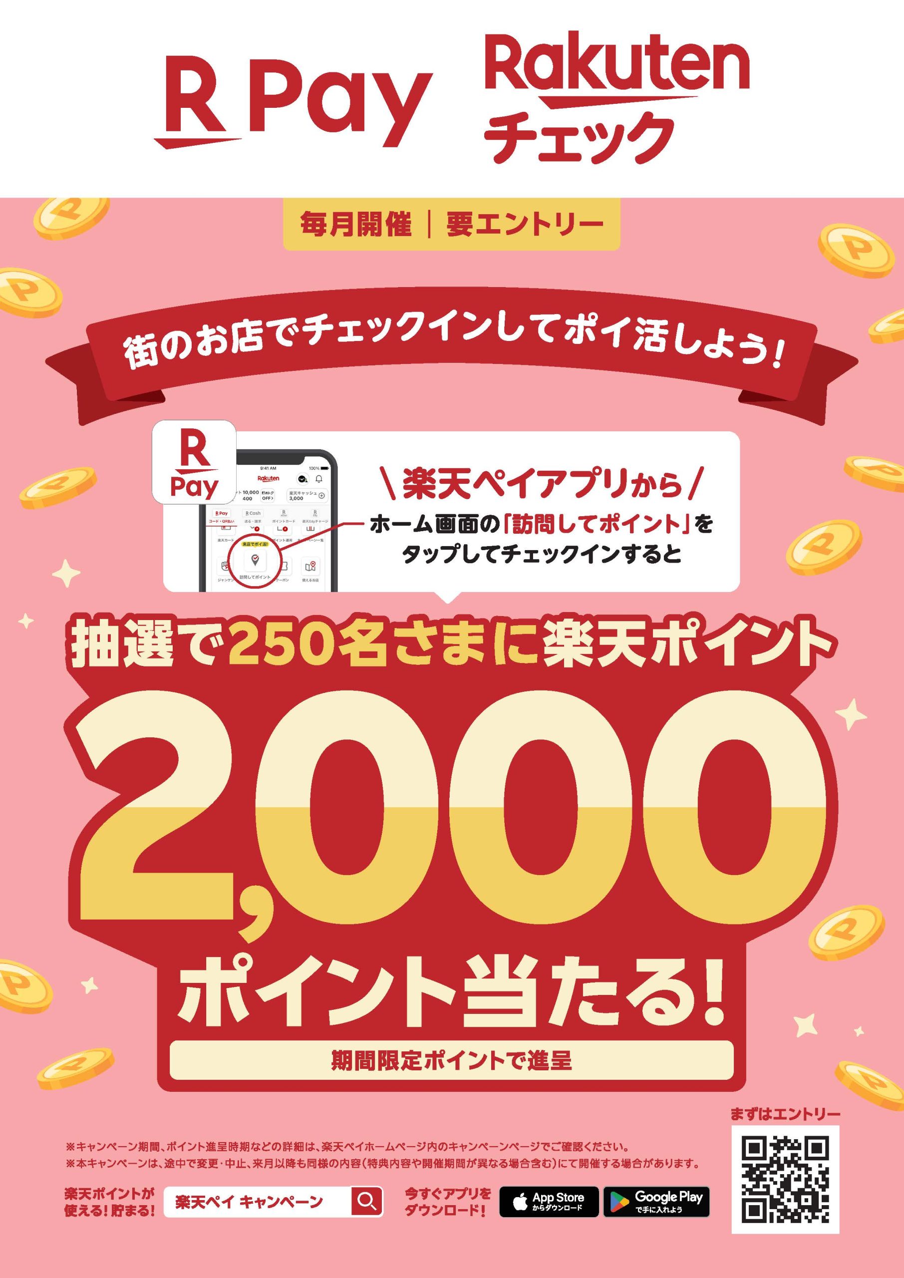 楽天ペイアプリでチェックインすると抽選で楽天ポイント2,000ポイント当たる! 2026 4/01 2026年4月1日 【キャンペーン期間】4/1(水)10:00 ~5/1(金)23:59 エントリーはこちら! キャンペーン