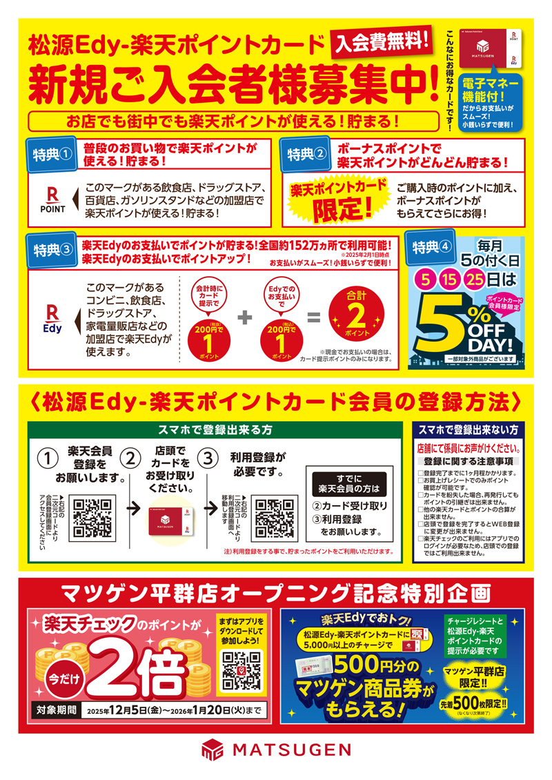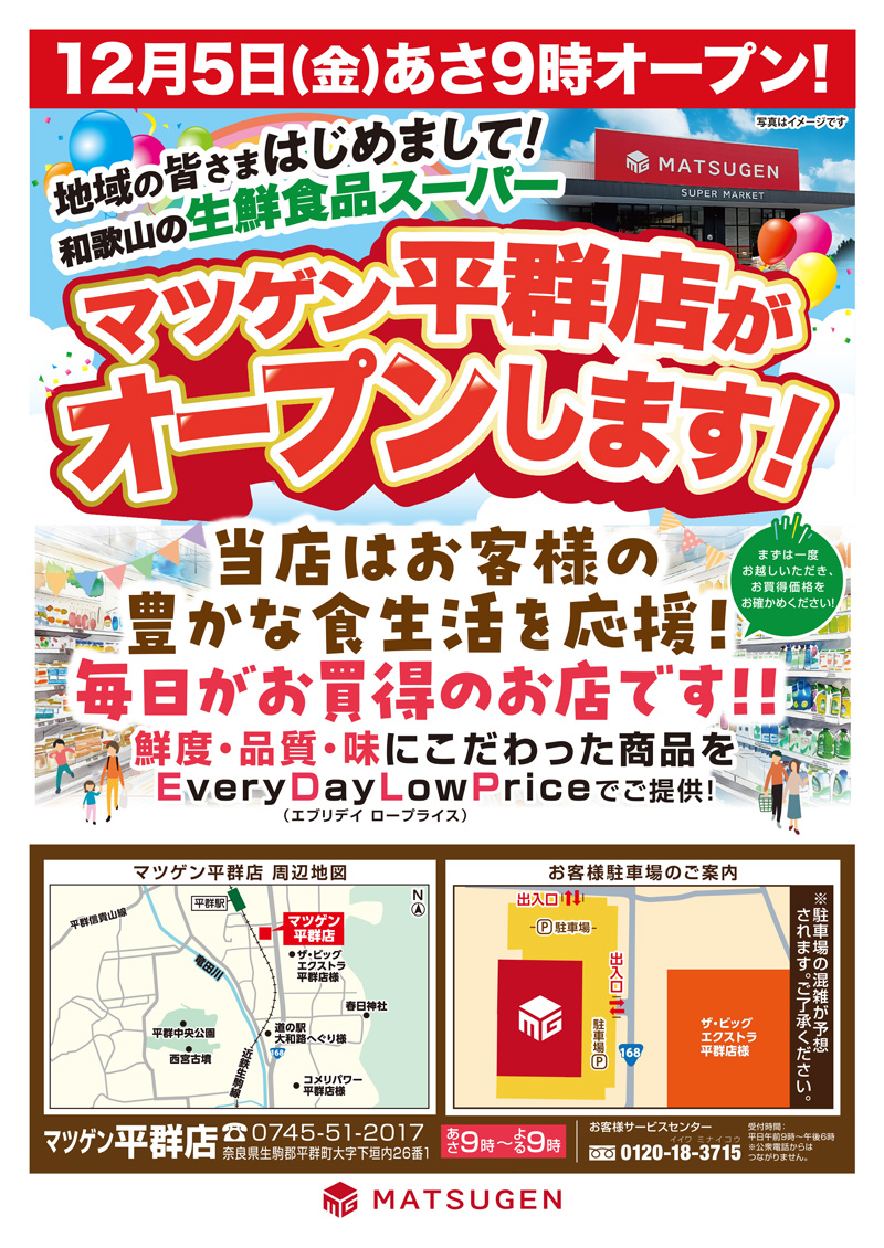 12月5日(金)「マツゲン平群店」がオープンする運びとなりましたのでご案内申し上げます。