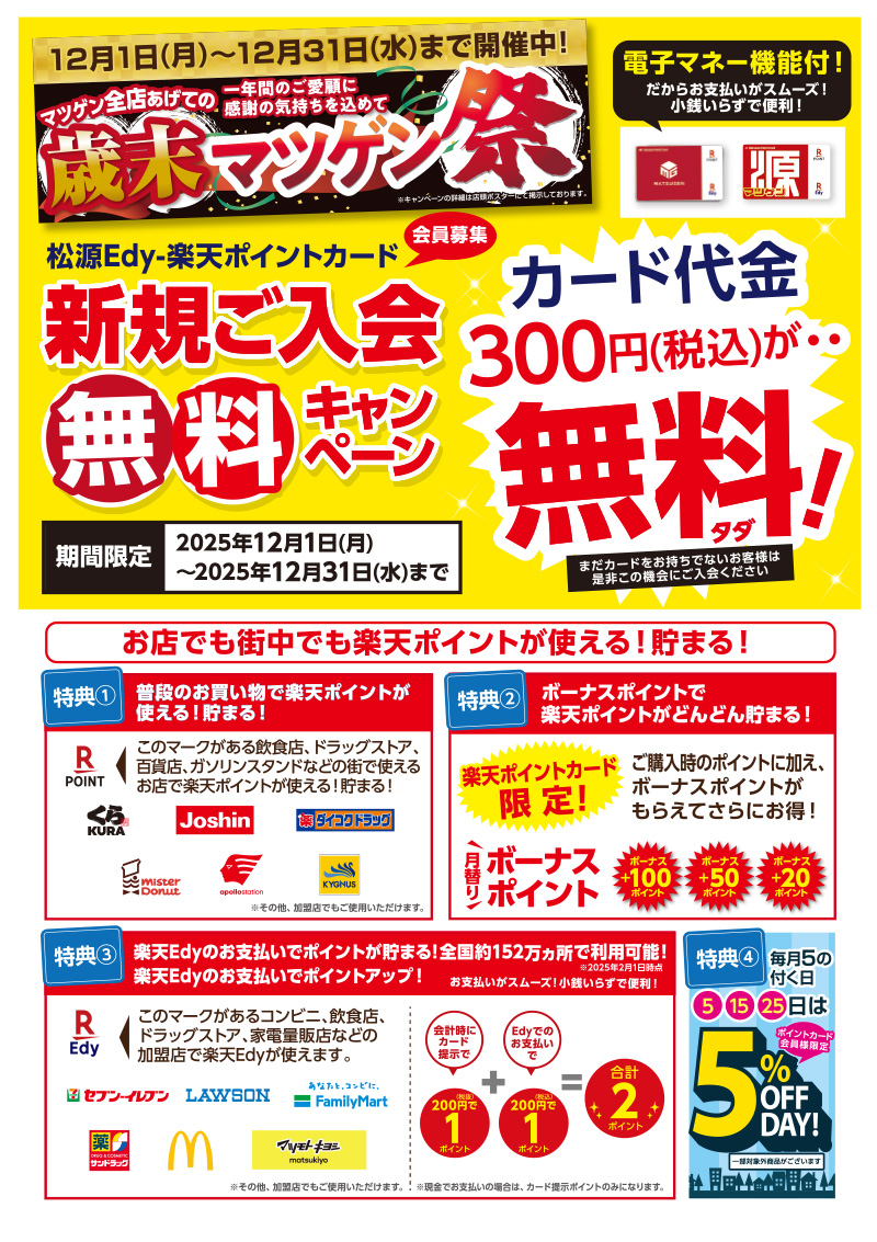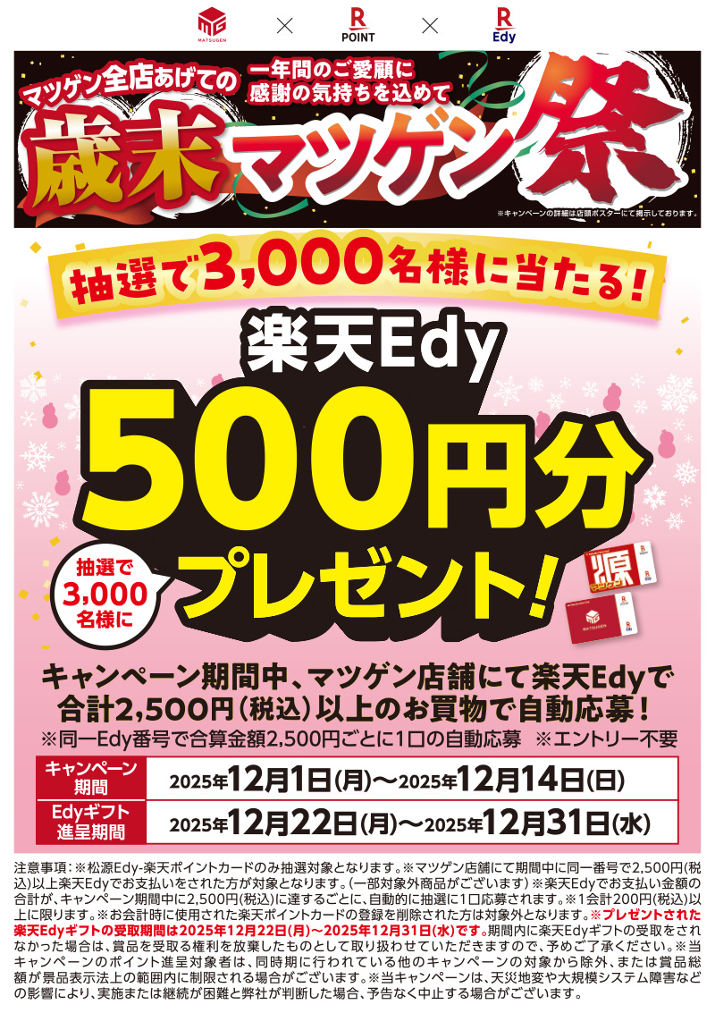 ※マツゲン店舗にて期間中に同一番号で2,500円(税込)以上Edy支払いをされた方が対象となります。