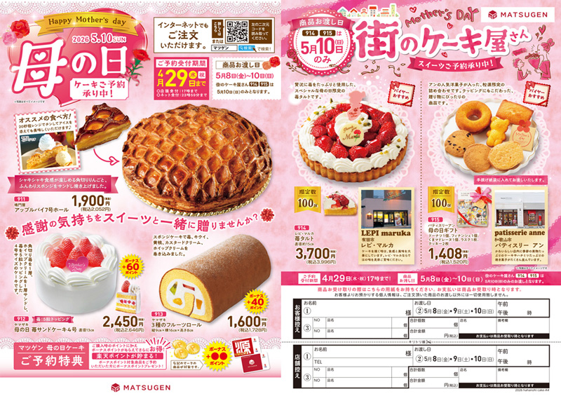 5月10日(日)の母の日に向けて、ケーキ・洋菓子のご予約を承り中です。