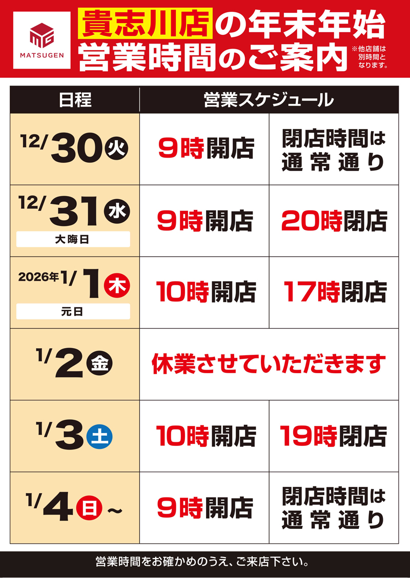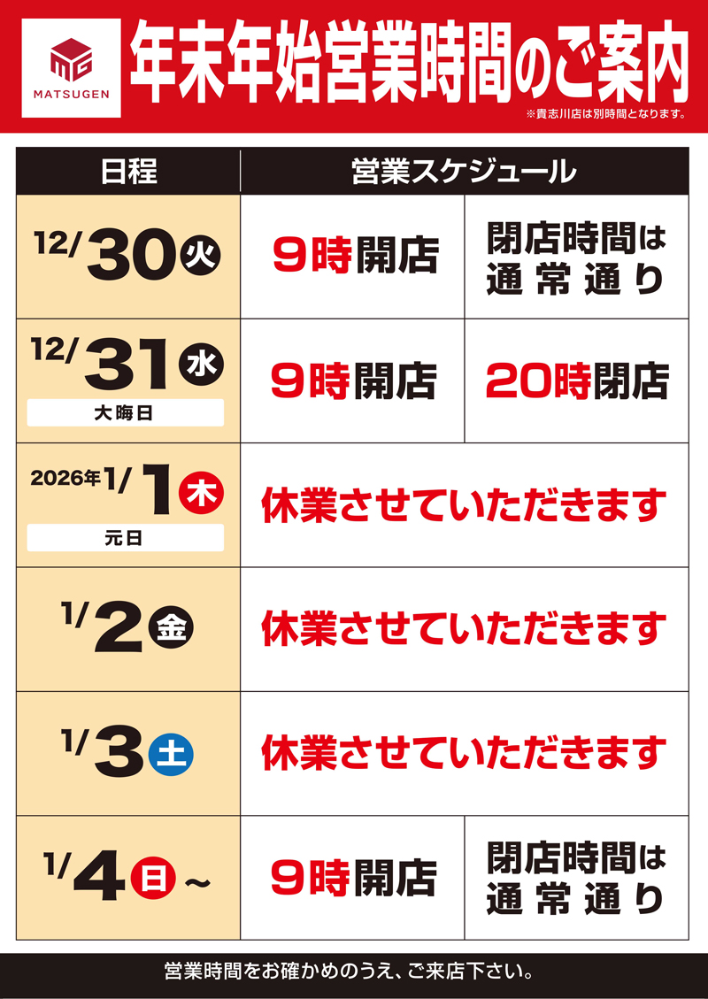 年末年始の営業時間のご案内 2025 12/10 2025年12月10日 12月31日(水)から1月3日(土)まで、松源各店の営業時間は下記の通り変更となります。ご来店の際は、営業時間をご確認の上お越しいただきますようお願い申し上げます。 ※なお、貴志川店のみ営業時間が異なりますので、ご利用のお客様はご注意ください。 ●全店(貴志川店は除く) ●貴志川店のみ お知らせ