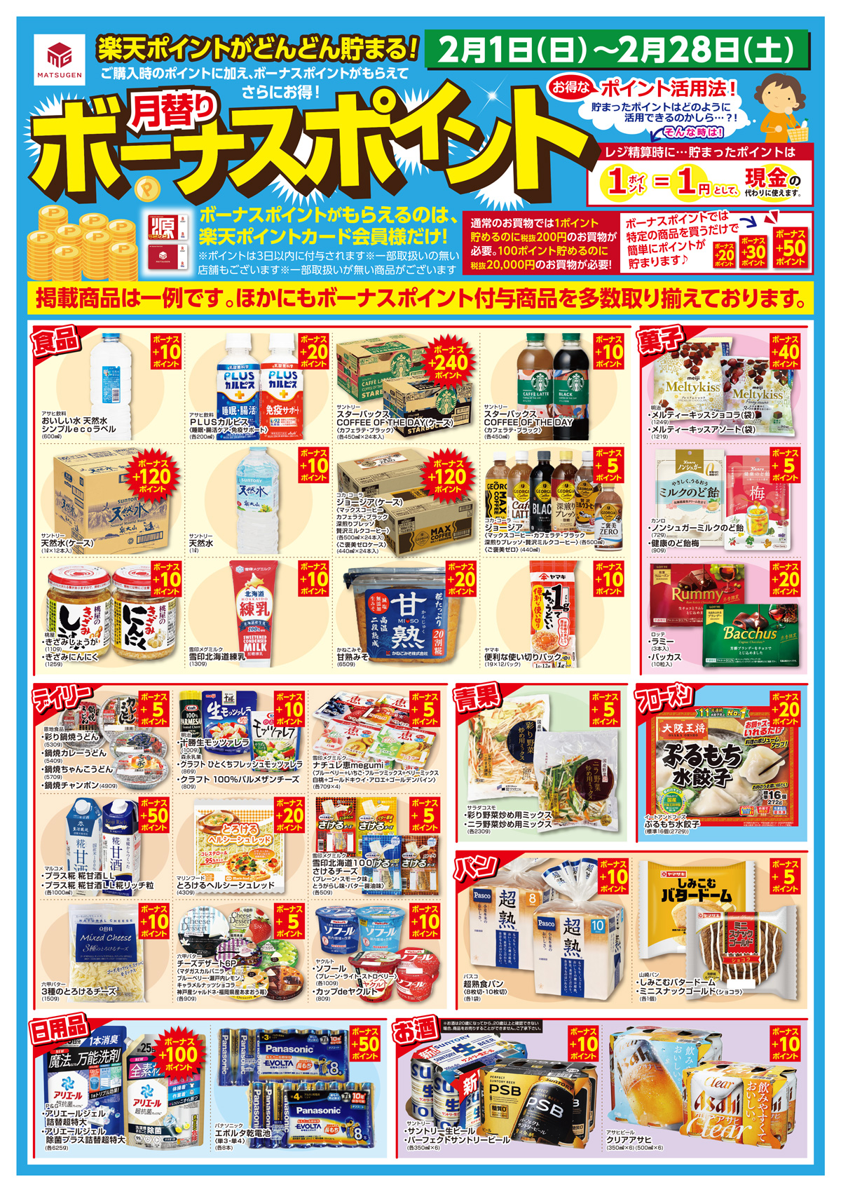 楽天ポイントカード会員様限定 月替わりボーナスポイント! 2026 2/01 2026年2月1日 楽天ポイントがどんどん貯まる!月替わりボーナスポイント!ご購入時のポイントに加え、ボーナスポイントがもらえてさらにお得! 「松源Edy-楽天ポイントカード」をお持ちではないお客様は、お気軽にスタッフにお尋ねください。 お知らせ
